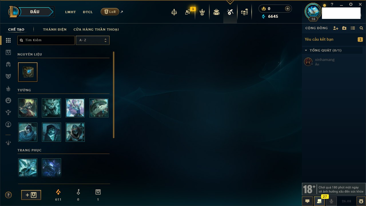 Rank Đơn: Chưa rank mùa nàoKhung: Chưa có khungTướng: 1 - Còn 3000 THXTrang Phục: 0Rank ĐTCL: Chưa RankLinh Thú: 10