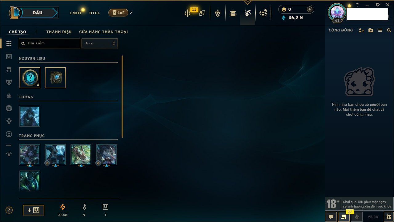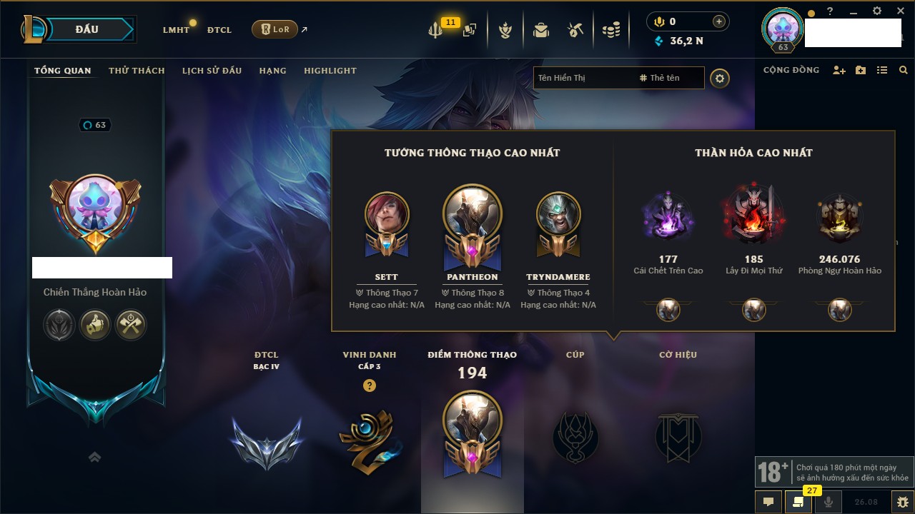 Rank Đơn: Chưa rank mùa nàoKhung: Chưa có khungTướng: 172 - Còn 6645 THXTrang Phục: 13Rank ĐTCL: Chưa RankLinh Thú: 22