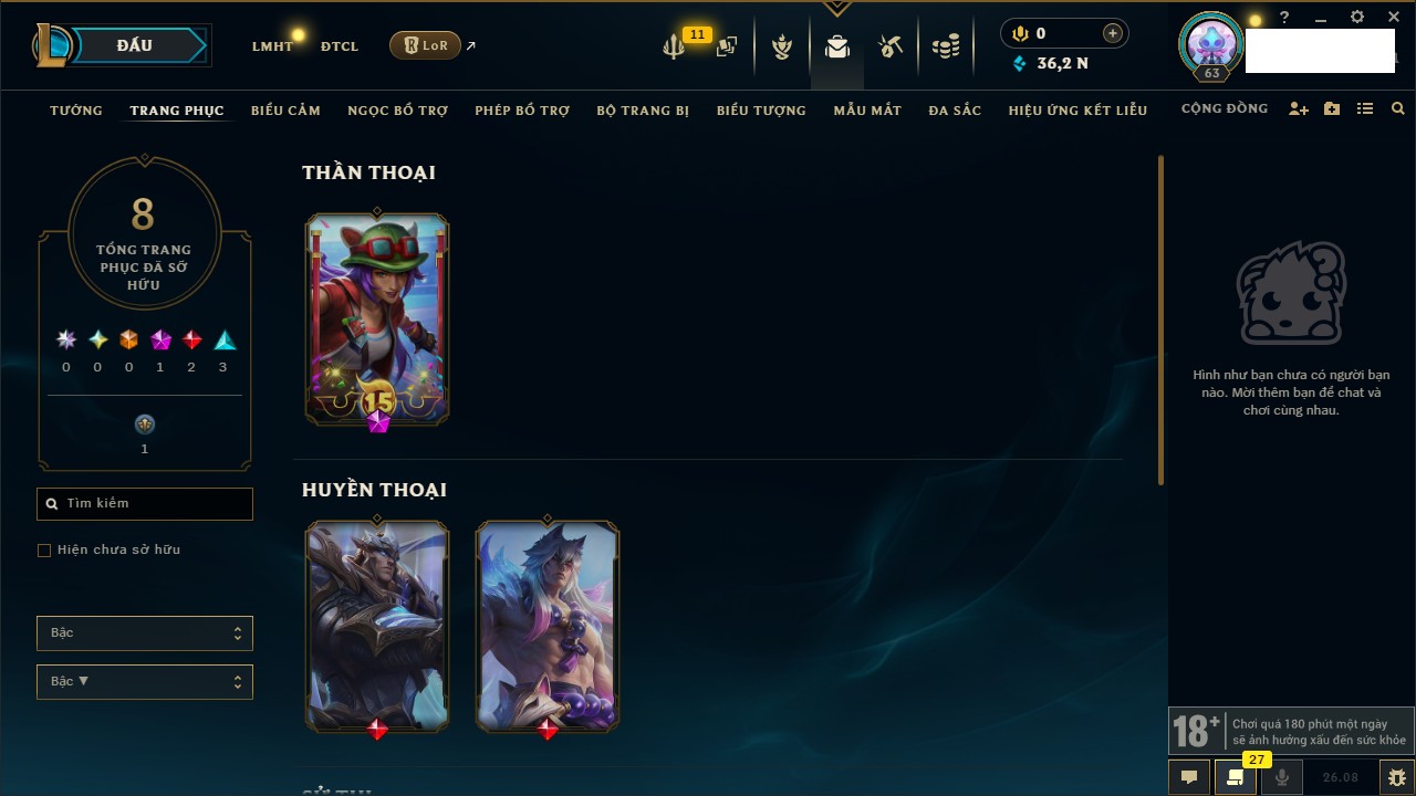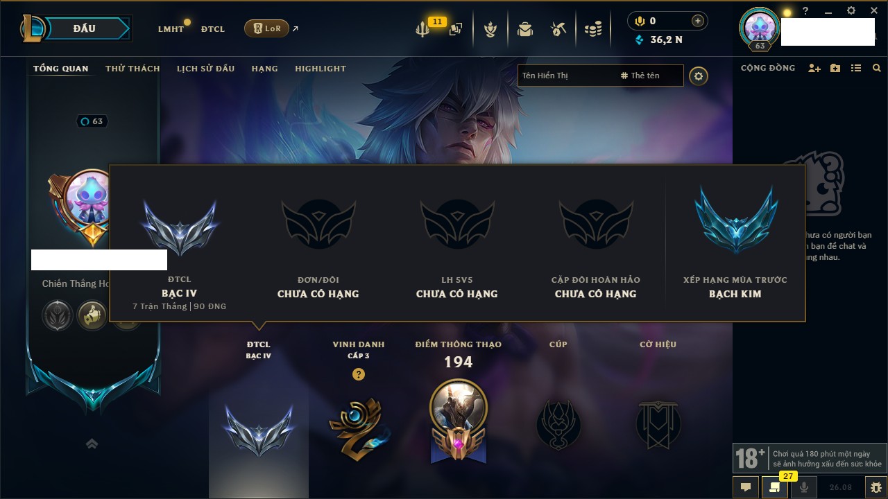 Rank Đơn: Chưa RankKhung: BạcTướng: 63 - Còn 36272 THXTrang Phục: 8Rank ĐTCL: Bạc IVLinh Thú: 73