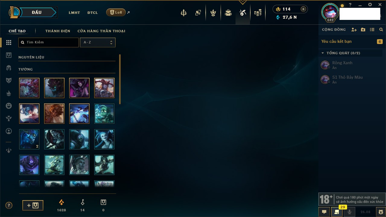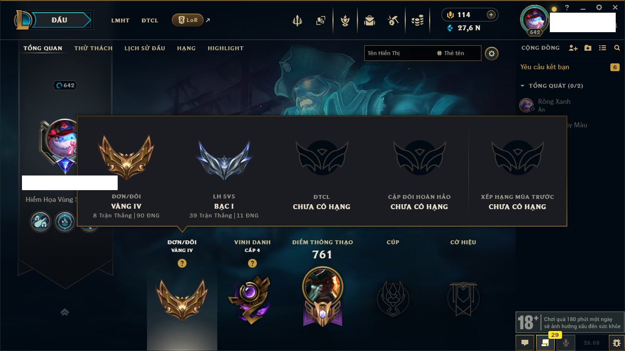 Rank Đơn: Chưa RankKhung: Chưa có khungTướng: 165 - Còn 79975 THXTrang Phục: 210Rank ĐTCL: Chưa RankLinh Thú: 149