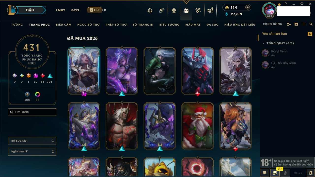 Rank Đơn: Chưa RankKhung: Chưa có khungTướng: 169 - Còn 43188 THXTrang Phục: 205Rank ĐTCL: Chưa RankLinh Thú: 259