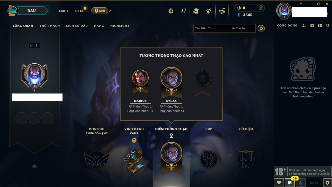 Rank Đơn: Chưa RankKhung: Chưa có khungTướng: 60 - Còn 181 THXTrang Phục: 8Rank ĐTCL: Chưa RankLinh Thú: 1