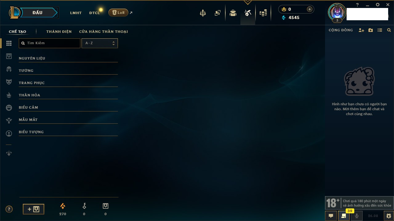 Rank Đơn: Chưa rank mùa nàoKhung: Chưa có khungTướng: 0 - Còn 7500 THXTrang Phục: 0Rank ĐTCL: Chưa rank mùa nàoLinh Thú: 14
