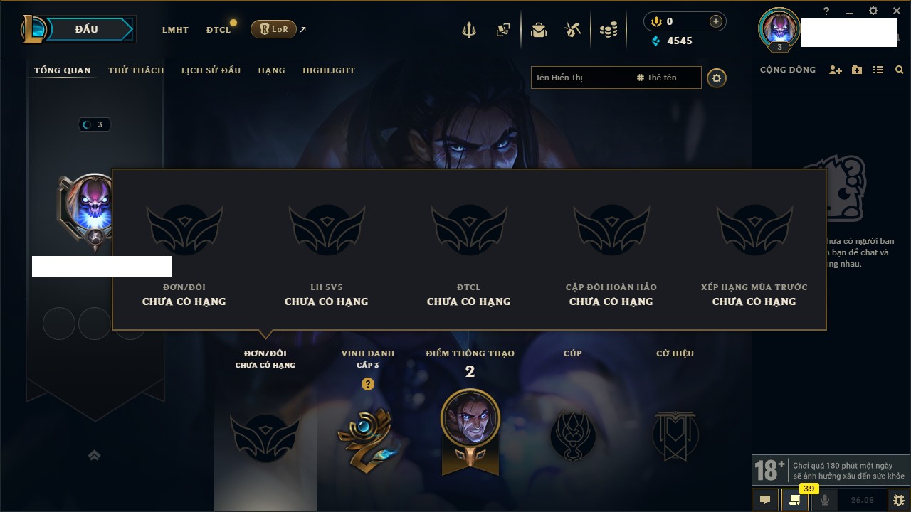 Rank Đơn: Chưa rank mùa nàoKhung: Chưa có khungTướng: 6 - Còn 4545 THXTrang Phục: 0Rank ĐTCL: Chưa RankLinh Thú: 5