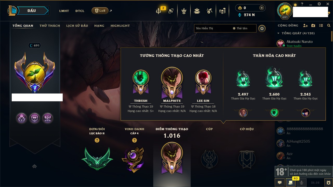 Rank Đơn: Bạch Kim IKhung: Bạch kimTướng: 172 - Còn 112652 THXTrang Phục: 318Rank ĐTCL: Chưa RankLinh Thú: 66