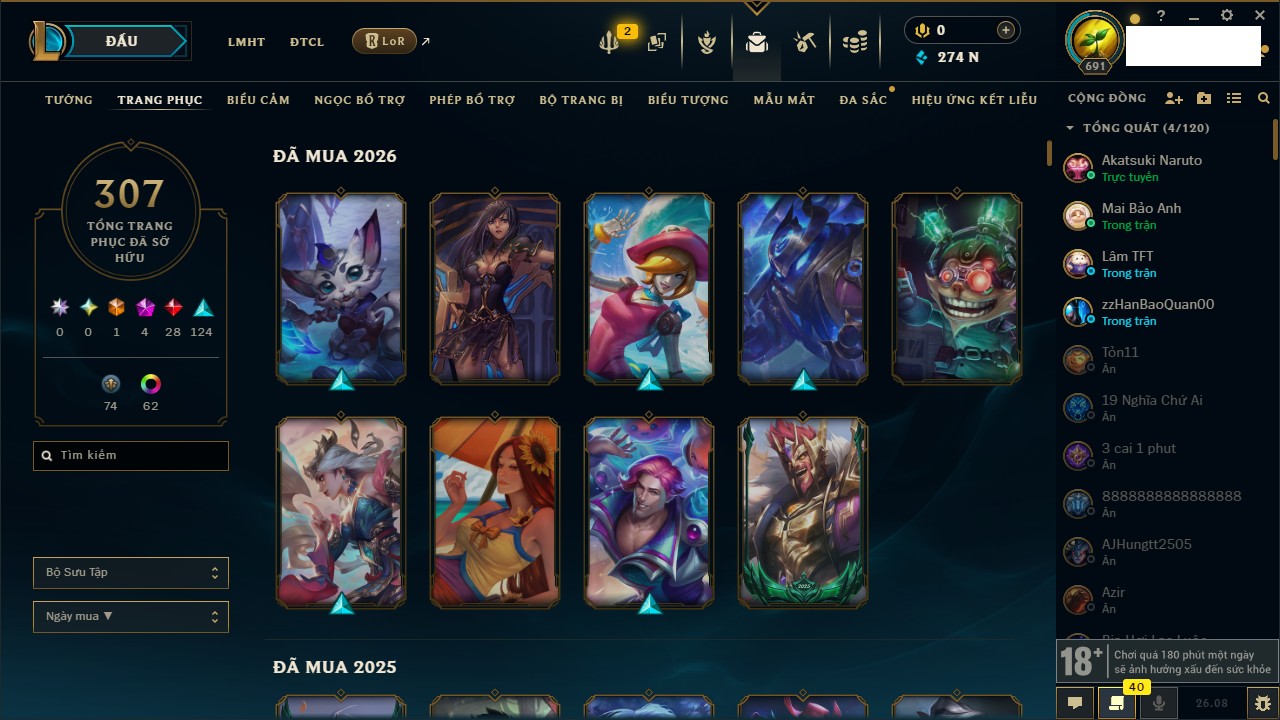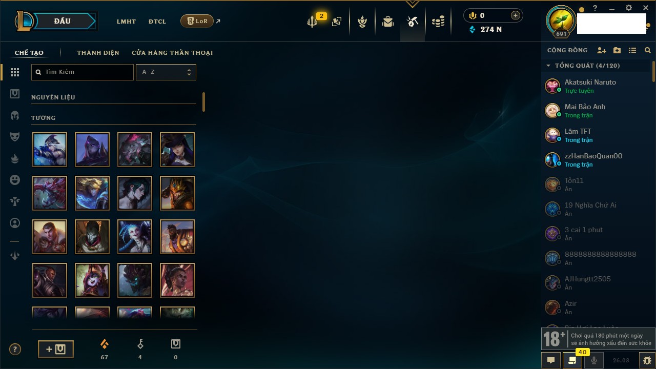 Rank Đơn: Vàng IIKhung: VàngTướng: 172 - Còn 414747 THXTrang Phục: 288Rank ĐTCL: Chưa RankLinh Thú: 152