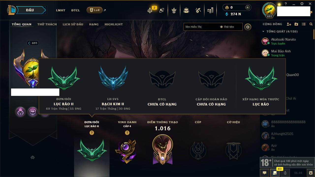 Rank Đơn: Lục Bảo IIKhung: Bạch kimTướng: 172 - Còn 274599 THXTrang Phục: 307Rank ĐTCL: Chưa RankLinh Thú: 158