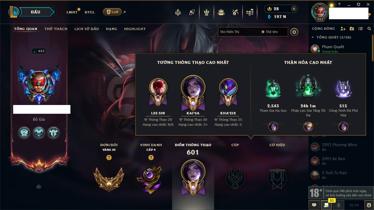 Rank Đơn: Chưa RankKhung: Bạch kimTướng: 86 - Còn 1608 THXTrang Phục: 47Rank ĐTCL: Chưa RankLinh Thú: 58