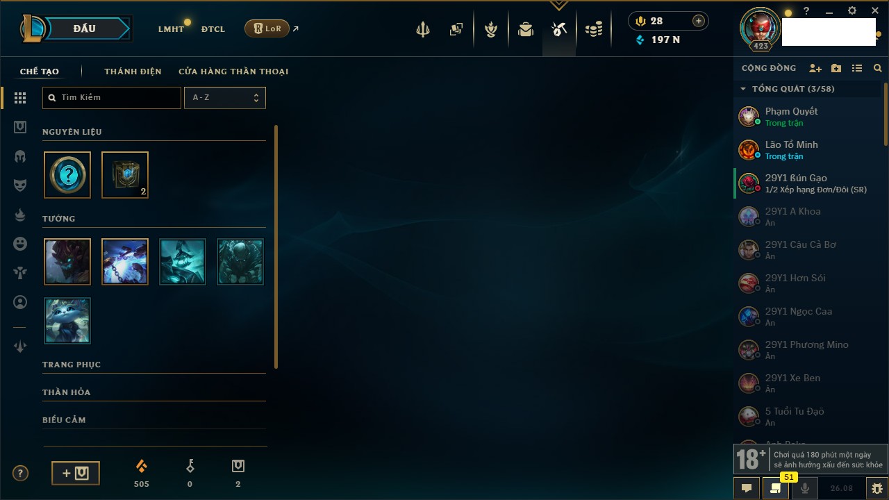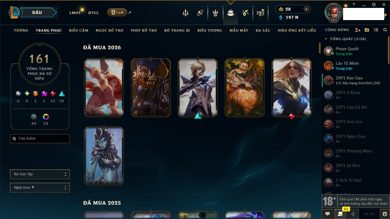 Rank Đơn: Vàng IIIKhung: BạcTướng: 172 - Còn 197042 THXTrang Phục: 161Rank ĐTCL: Chưa RankLinh Thú: 186