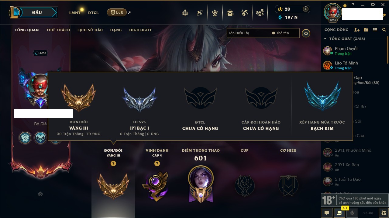Rank Đơn: Bạch Kim IVKhung: Bạch kimTướng: 172 - Còn 190124 THXTrang Phục: 180Rank ĐTCL: Vàng IVLinh Thú: 128