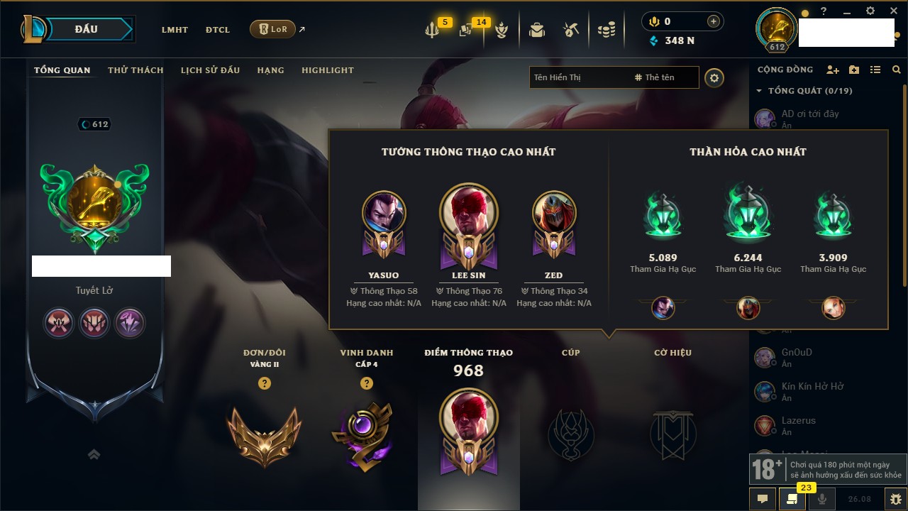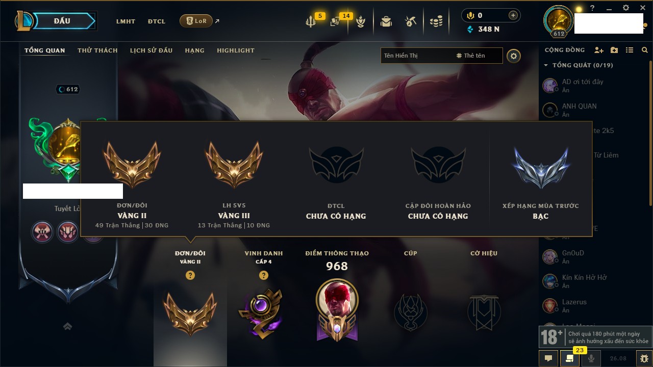 Rank Đơn: Bạch Kim IIKhung: Bạch kimTướng: 167 - Còn 319 THXTrang Phục: 352Rank ĐTCL: Chưa RankLinh Thú: 14