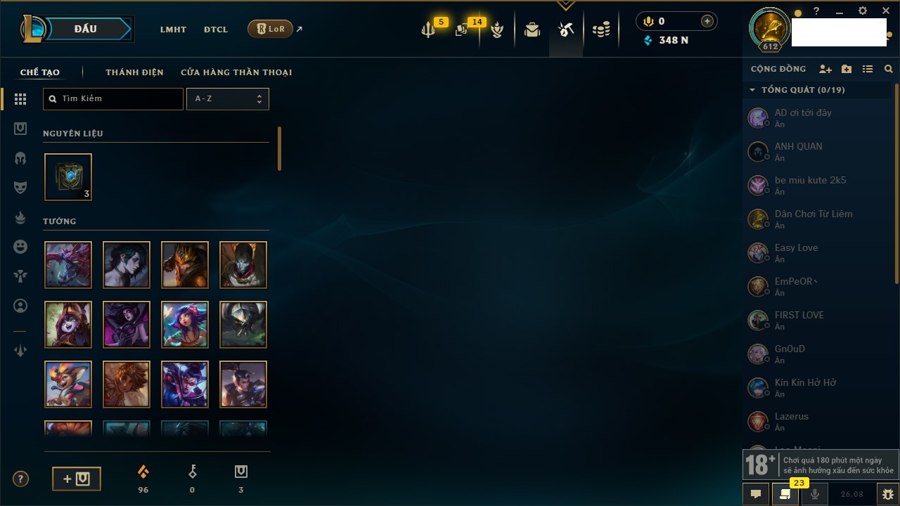Rank Đơn: Vàng IIKhung: VàngTướng: 172 - Còn 414747 THXTrang Phục: 288Rank ĐTCL: Chưa RankLinh Thú: 152