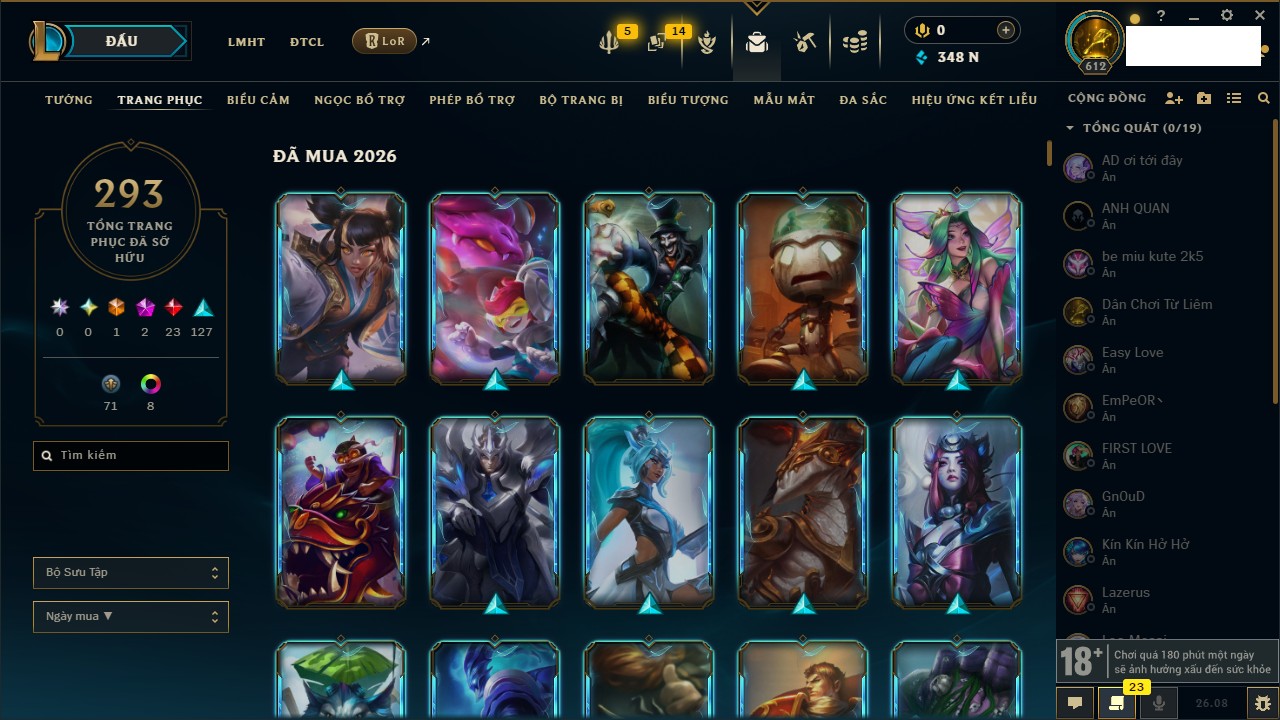 Rank Đơn: Vàng IIKhung: BạcTướng: 172 - Còn 348762 THXTrang Phục: 293Rank ĐTCL: Chưa RankLinh Thú: 44