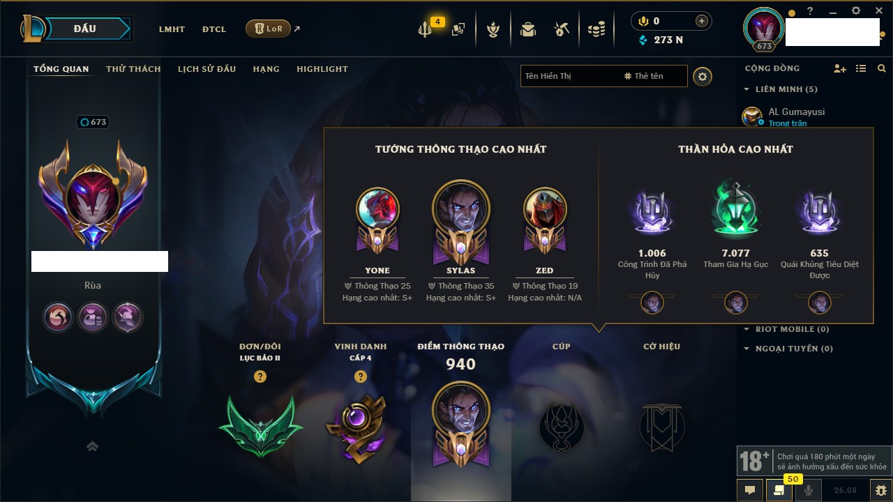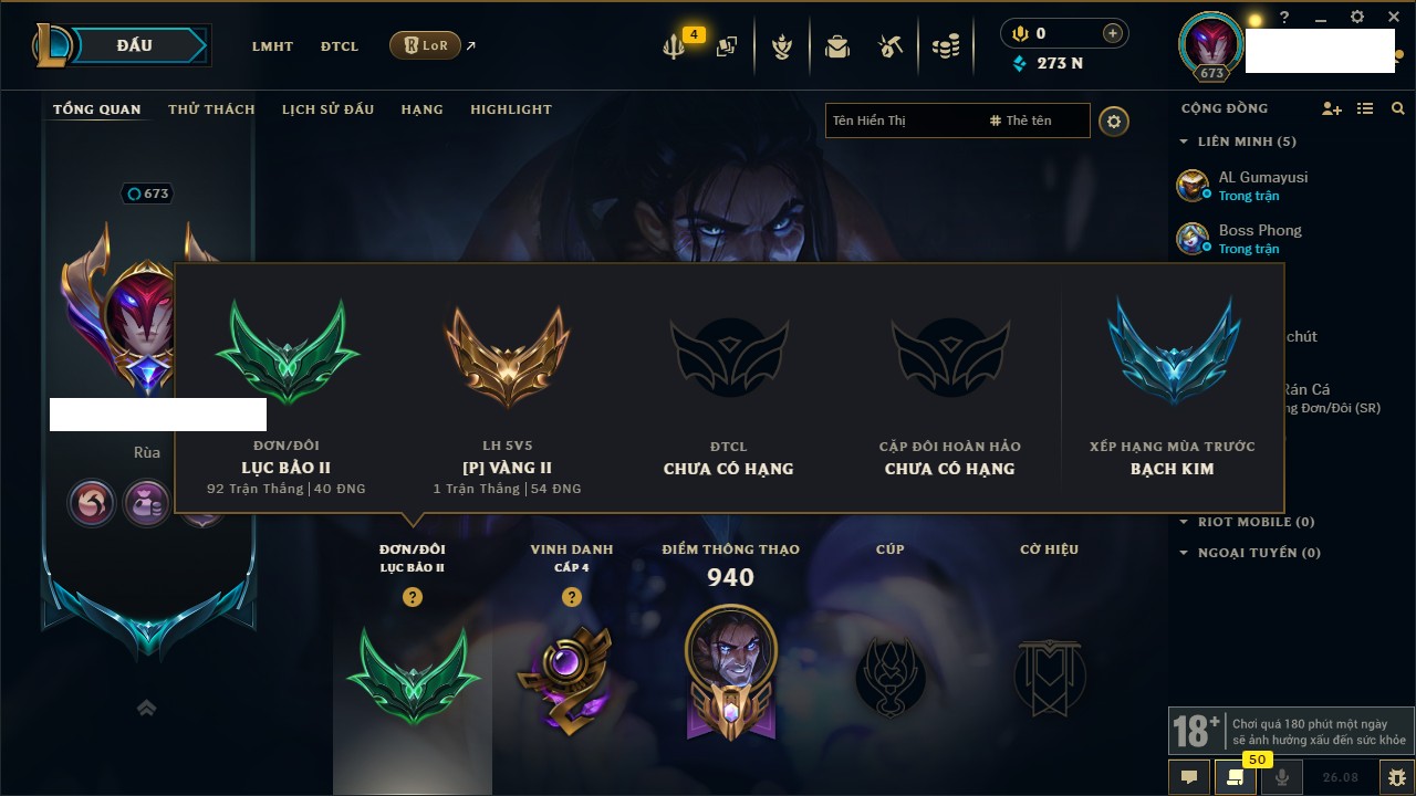 Rank Đơn: Bạch Kim IIKhung: Bạch kimTướng: 167 - Còn 319 THXTrang Phục: 352Rank ĐTCL: Chưa RankLinh Thú: 14