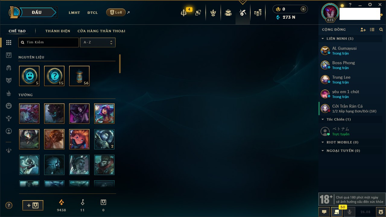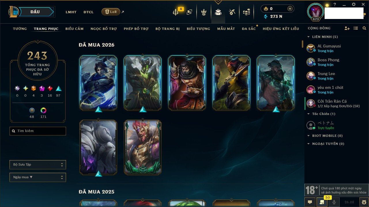 Rank Đơn: Vàng IIKhung: VàngTướng: 172 - Còn 414747 THXTrang Phục: 288Rank ĐTCL: Chưa RankLinh Thú: 152